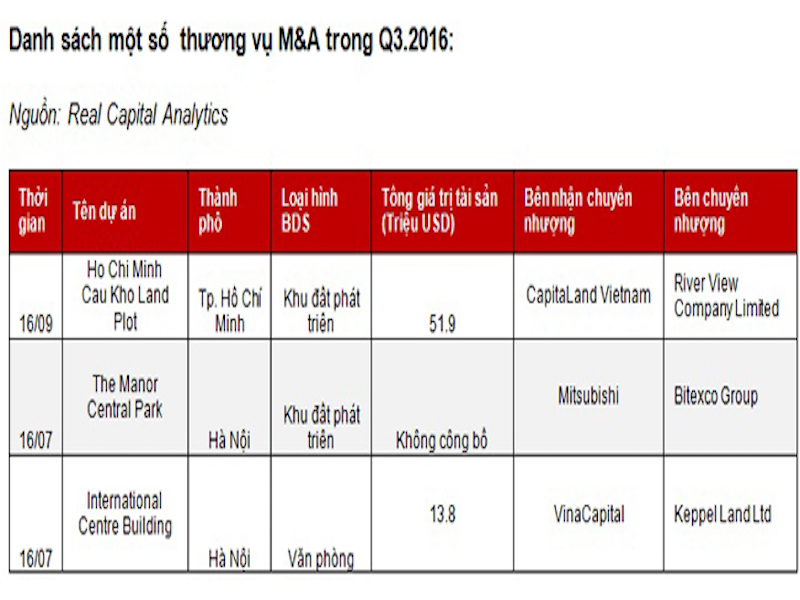 2 thương vụ còn lại là việc Mitsubishi góp vốn liên doanh phát triển Dự án The Manor Central Park của Bitexco tại Hà Nội và VinaCapital mua lại cao ốc văn phòng International Centre Building từ Keppel Land.