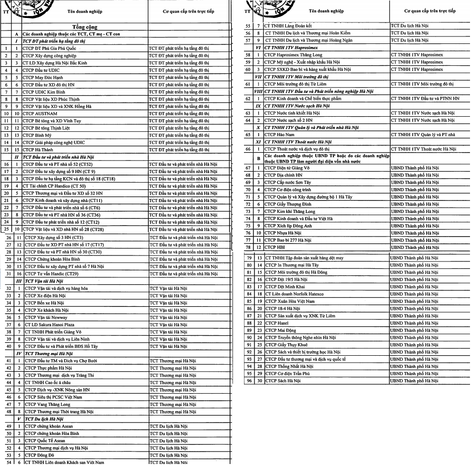 Theo kế hoạch được UBND Tp. Hà Nội công bố, sẽ có 96 doanh nghiệp lọt nhóm doanh nghiệp mà Tp. Hà Nội triển khai thoái vốn nhà nước đầu tư có 30 doanh nghiệp trực tiếp do UBND Hà Nội nắm giữ vốn và 66 doanh nghiệp do đơn vị trực thuộc UBND Tp. Hà Nội nắm giữ.