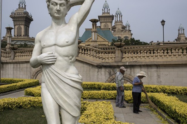 Nhiều người muốn chạy trốn khỏi sự hỗn loạn của phát triển đô thị giữa lòng sông Chaobai. Đi sâu về phía Nam, tại thành phố Jing Jin, những người nông dân lại trở thành thợ cắt tỉa cây cảnh, lau dọn tượng đài bên ngoài một khách sạn. Ảnh: Washington Post